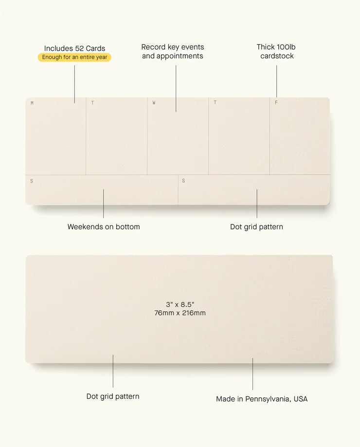 Una forma sencilla de planificar la semana y verlo todo de un vistazo. Cada paquete incluye 52 tarjetas, suficientes para todo un año.